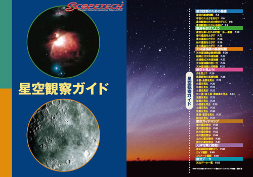 鏡筒+架台+三脚+接眼レンズ(2個)、天頂ミラーがセットになっており、これだけで、すぐに天体観察を始められます。A4版で写真や図版を多用した、わかりやすい『取扱説明書』(こちらでダウンロードできます)、藤井旭先生による、A4版オールカラー50ページの『天体観察ガイド』が付属します。