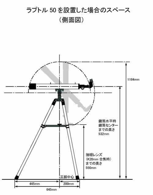 | 脚の長さ | 89cm(脚を開いて地面から望遠鏡接続部分まで 90cm)ページ下方に寸法図があります。 |
