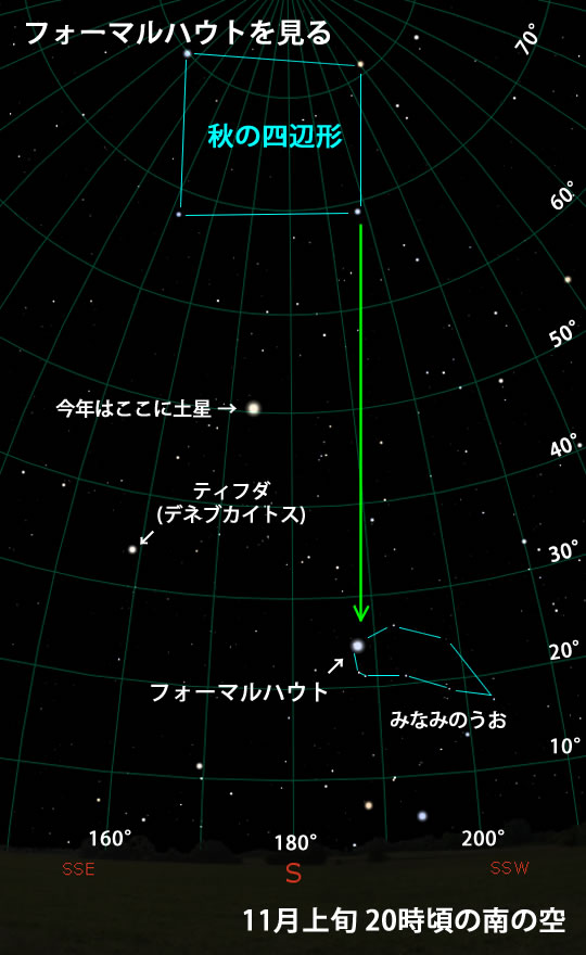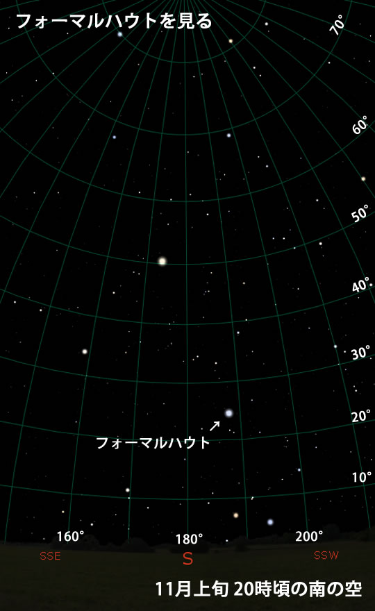 1等星ですから見つけるのは簡単、秋の四辺形から探しても良いですが、そんなことをしなくとも、今月なら20時頃に南の低空に明るい星があります。それがフォーマルハウトです。