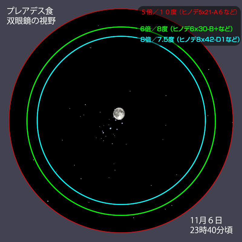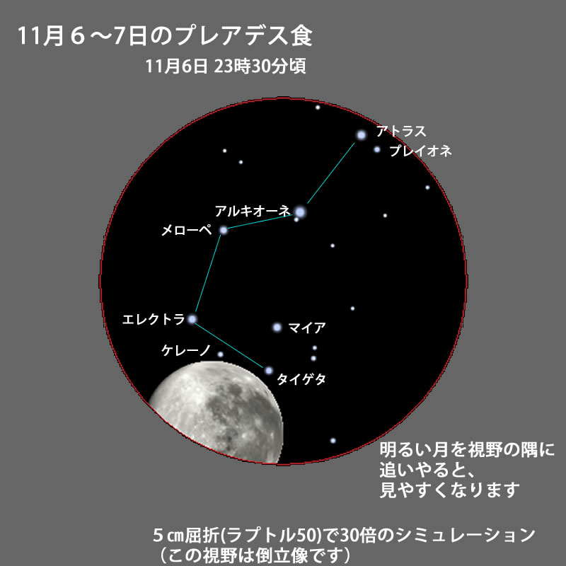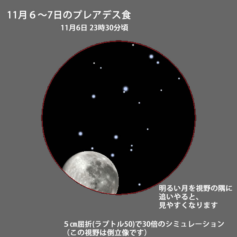 今回は、満月の翌日なので月がまぶしく、プレアデスが見ずらいです。双眼鏡より望遠鏡、それも少し倍率を上げた方がまぶしさが軽減されます。月を視野の端に寄せて見ると観望しやすくなるでしょう。