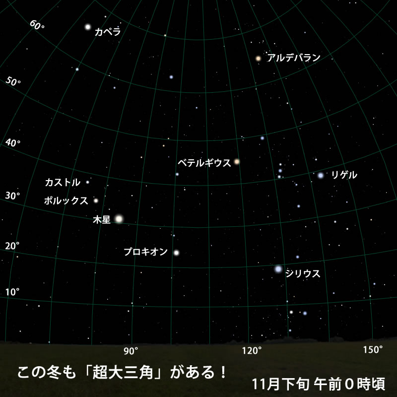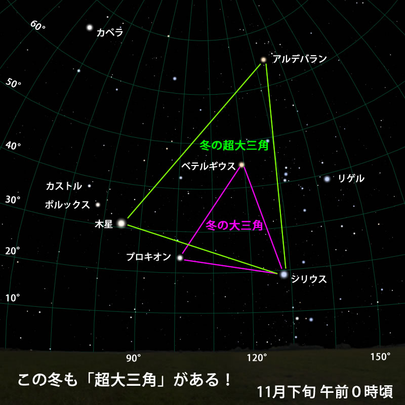 さて、今シーズンは木星がひじょうにつごうのよい場所にいるため、「冬の超大三角」が見られます。