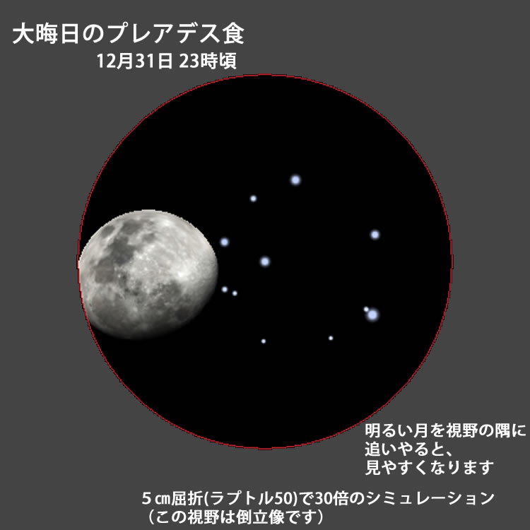 今月もプレアデス(すばる)食が見られます。それも大みそかの夜です。20時前後から見始めると面白いと思います、大そうじも片付き、年越しそばも食べ終わった頃、望遠鏡を月に向けてください。月がプレアデスの星を次々と隠していきます。寒くなったら暖かい部屋に戻って紅白を見て、暖まったらまた外へ出て・・・・これで除夜の鐘が聞こえてくれば最高なのですが・・・・。