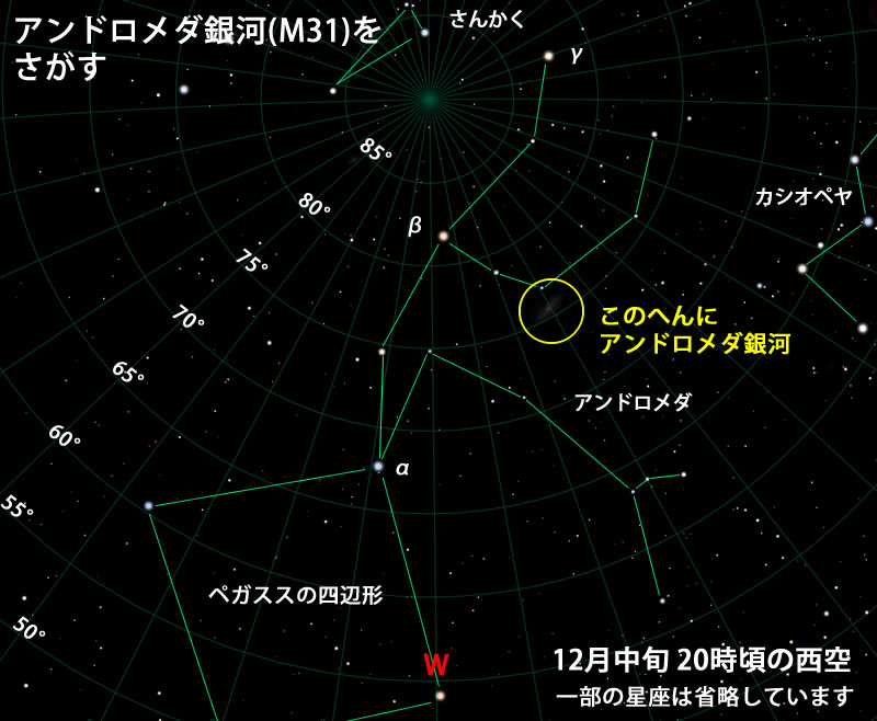 アンドロメダ座のα星とγ星を直線で結ぶと、ほぼ中間にあるのがβ星。このβ星から直角に北側(カシオペヤ側)に折れると、ちょっとした星の集まりがあります。そのあたりをよくご覧ください。双眼鏡や望遠鏡(なるべく低倍率)で見ると、ボーっとにじんだような、小さな霞のように見えるものがあります。これがM31です。