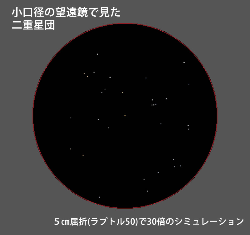 月のない夜なら口径3㎝ていど双眼鏡でもパラパラっとした星団の姿がわかります。5㎝クラスの双眼鏡なら一つひとつの星に分離できて、面白い眺めです。