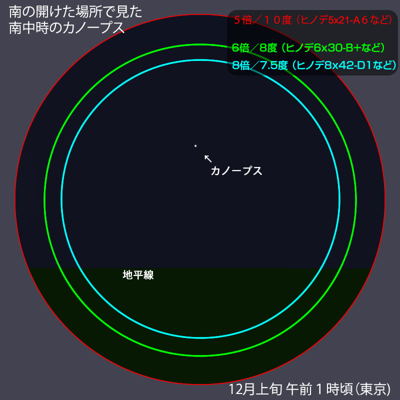 地平線ぎりぎりに見えるカノープスは、地上の風景と対比しやすいので、思ったより早く移動していることがわかります。これも楽しみのひとつでしょう。